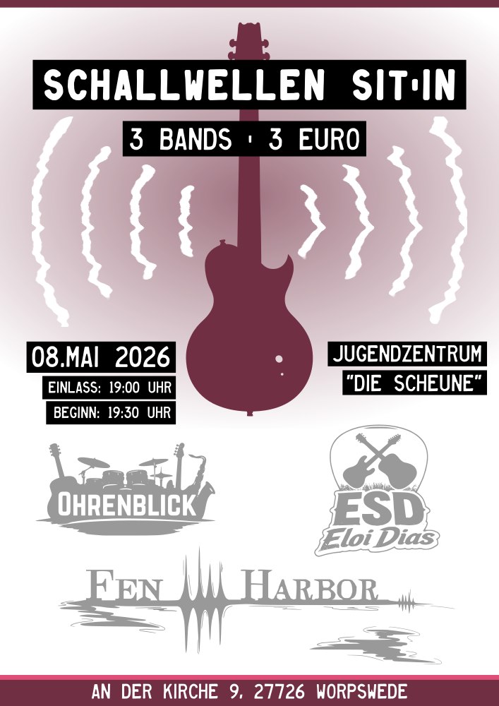 Drei Bands - drei Euro. So lautet das Motto des Schallwellen Sit-Ins in der Jugendscheune Worpswede. Nach ein paar Jahren Pause ist 'die Schallwelle' wieder da. Dieses Mal mit 'Ohrenblick' (Songwriter-Punkrock mit Saxophon), 'Eloy Dias' (Blues-Rock) und 'Fen Harbor' (Rock). Es hat sich dieses Mal also ergeben, dass ich mit meinen beiden Bands (Ohrenblick und Fen Harbor) an einem Abend spielen kann.