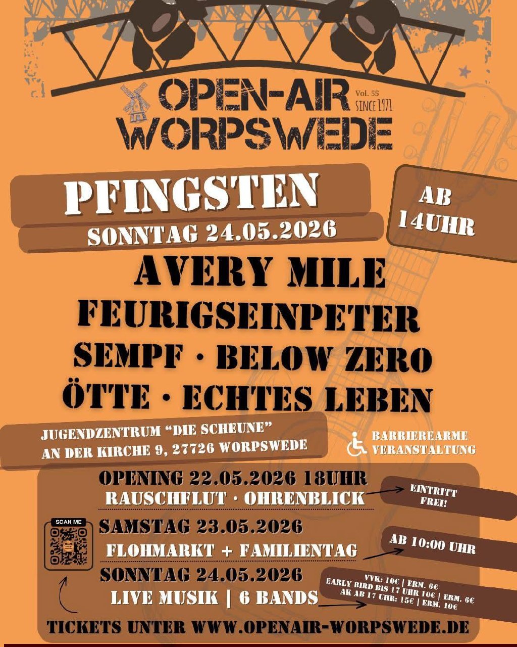 Ich freue mich, zusammen mit meiner Band 'Ohrenblick' am Freitag, den 22.05. das 55. Open Air Worpswede Festival eröffnen zu dürfen. Der Eintritt ist an diesem Abend frei, außer uns spielen noch die Jungs von 'Rauschflut'.